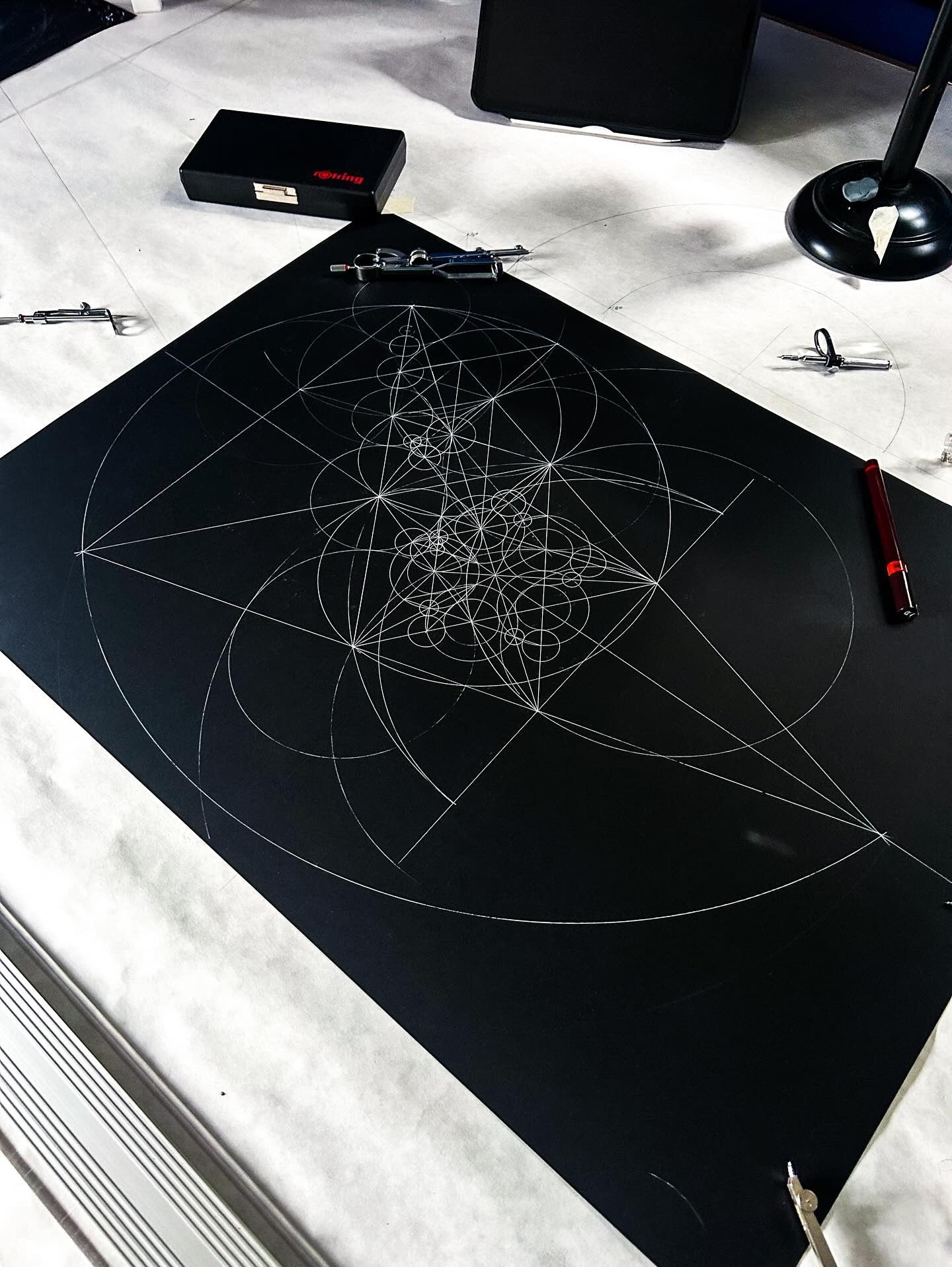 His fascination with geometric patterns deepened after stumbling upon a book on Metatron's Cube and the Flower of Life, sparking a creative exploration that integrated these motifs into his artwork.